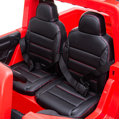 Meant to stand out from the rest, this two-seater Red Jeep Wrangler has an authentic style. From the style of the front grill to the wheels, this Jeep is just like what you'd expect with the real thing!